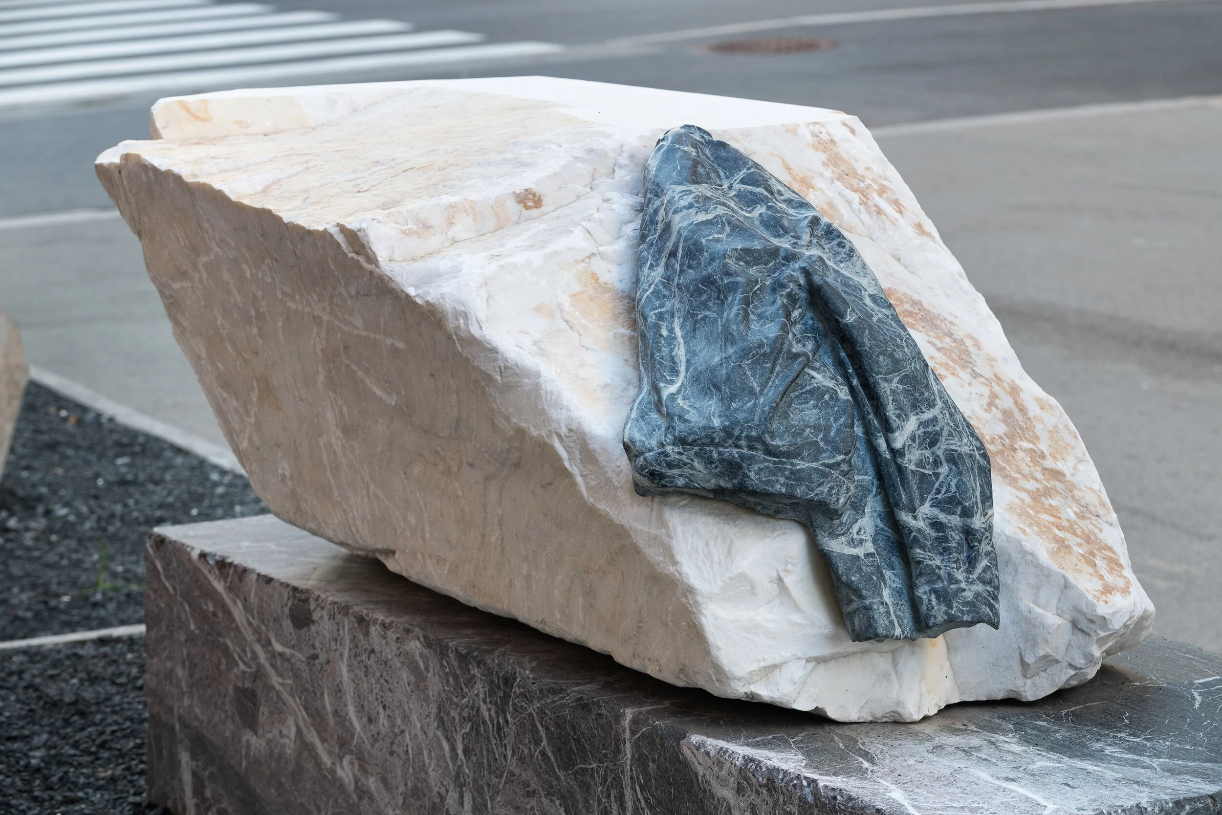 Jeg vil arbeide med å skape et slags tilfeldig sted, slik man kan komme over det både i by og natur. Et sted der en tilfeldig ansamling av ulike objekt, gir mulighet for at en ny fortelling kan ta form. Stenene i skulpturen, som allerede konkret, komprimert tid og sted i seg, åpner også for at nye rom kan oppstå. Skulpturen består av 3 ulike marmortyper (Rosso Levanto, Carrara og Spider green) i mer eller mindre ubearbeidet form. De to store blokkene har stort sett den form de hadde da jeg fant dem, bortsett fra noe justering av størrelsen.