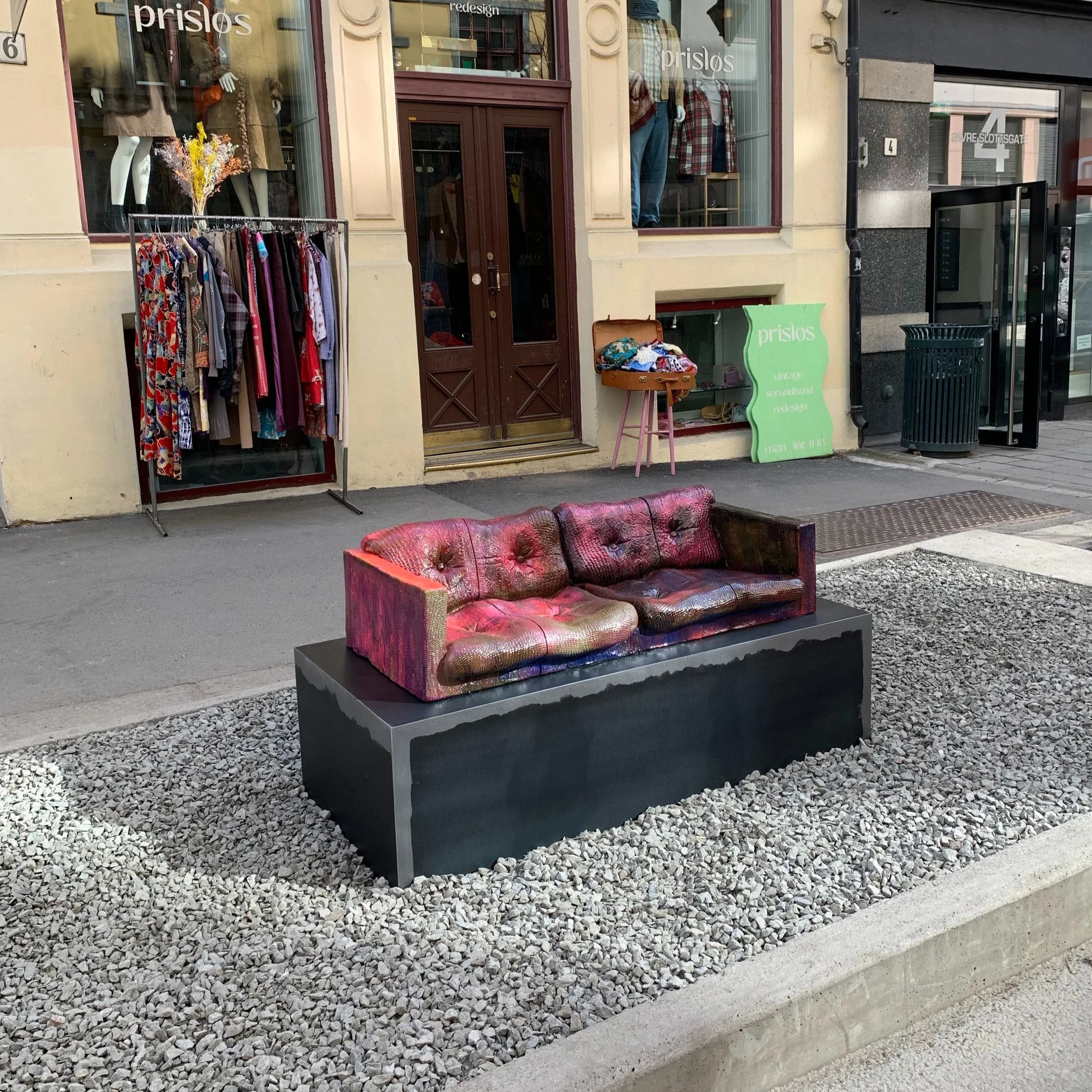 Historisk sett har sofaen utviklet seg fra å være en sosial markør for en dekadent elite til et liggemøbel for konsum av lavkultur. Begrep som sofasliter og sofagenerasjon vitner om at sofaen har blitt et sted hvor vi henfaller til en passiv livsstil, hvor vi kan konsumere fortellingen om andres liv uten selv å bli sett. Med sofaen plassert på gata er den beskyttende og isolerende atmosfæren borte og betrakterposisjonen er snudd. Det skjulte livet bak husets fire vegger kommer til syne.